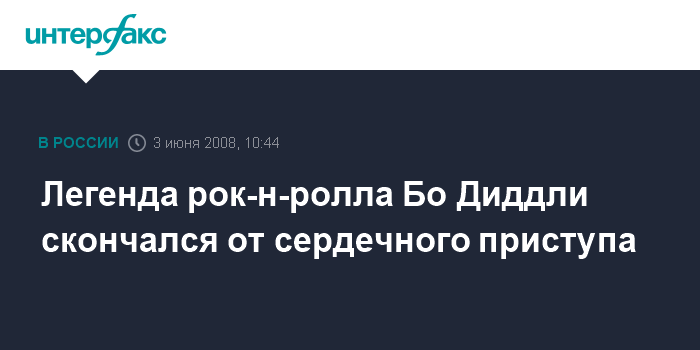 Нью-Йорк. 3 июня. INTERFAX.RU - Всемирно известный гитарист Бо Диддли скончался в возрасте 79 лет в американском штате Флорида, сообщает телекомпания CNN.