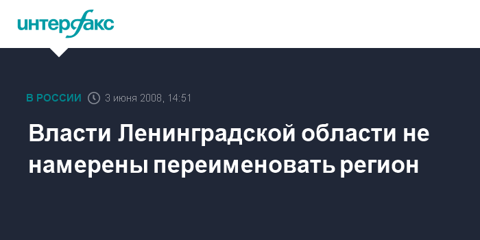Москва. 3 июня. INTERFAX.RU - Ленинградскую область в ближайшее время переименовывать не будут, сообщили "Интерфаксу" в отделе информации областного правительства.