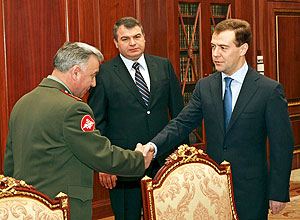 Медведев подчеркнул, что "многими вопросами (начальнику Генштаба) придется заниматься совместно с Советом безопасности". "Я прекрасно понимаю ответственность, которая теперь возложена вашим указом. Задачи, которые стоят перед Вооруженными силами, в частности дальнейшее развитие, вам доложены и утверждены. Они нам понятны и ясны, совместно с министром обороны мы их решим", - сказал в свою очередь новый начальник Генштаба.