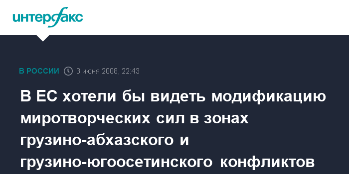 Москва. 3 июня. ИНТЕРФАКС - Евросоюз хотел бы видоизменения миротворческих сил в зонах грузино-абхазского и грузино-югоосетинского конфликтов.