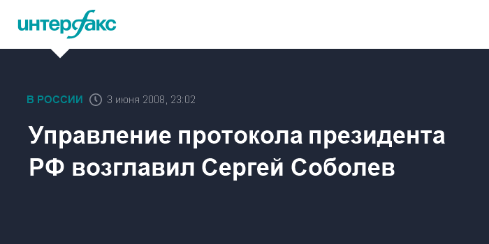 Москва. 3 июня. ИНТЕРФАКС - Президент России Дмитрий Медведев своим Указом назначил Сергея Соболева начальником Управления протокола президента РФ, сообщила во вторник пресс-служба Кремля.