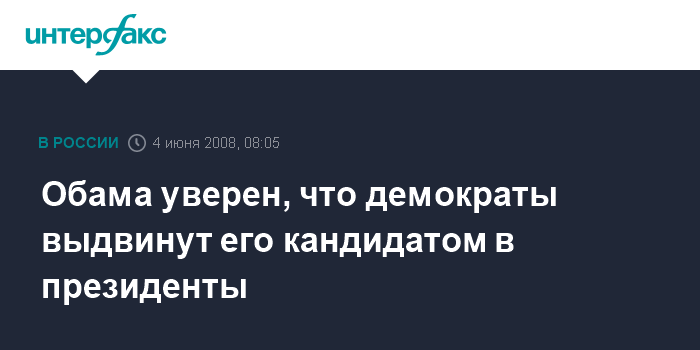 Вашингтон. 4 июня. INTERFAX.RU - Сенатор Барак Обама набрал необходимое число делегатов съезда Демократической партии для того, чтобы стать кандидатом на пост президента США.
