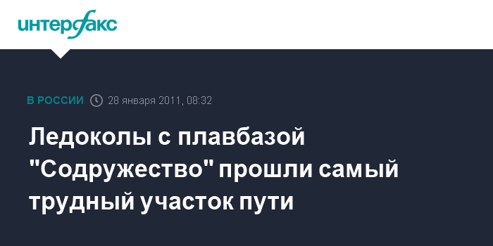 Южно-Сахалинск. 28 января. INTERFAX.RU - Караван из двух ледоколов "Красин" и "Адмирал Макаров", которые выводят изо льдов плавбазу "Содружество", с 26 января прошли восемь миль, сообщила в пятницу руководитель пресс-службы Дальневосточного морского пароходства (ДВМП, FESCO) Татьяна Куликова.