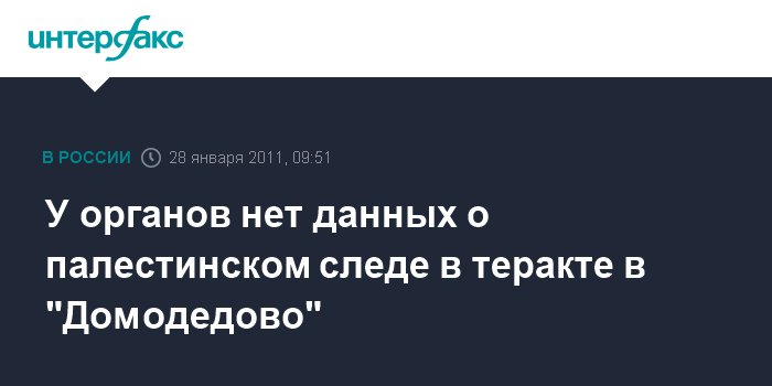 Москва. 28 января. INTERFAX.RU - Правоохранительные органы не располагают подтвержденными данными о причастности палестинских террористов к взрыву, который был совершен в минувший понедельник в столичном аэропорту "Домодедово".