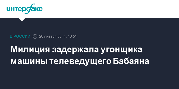 Москва. 28 января. INTERFAX.RU - Милиционеры обнаружили угонщика иномарки телеведущего канала "ТВ-Центр" Романа Бабаяна, сообщили в ГУВД.