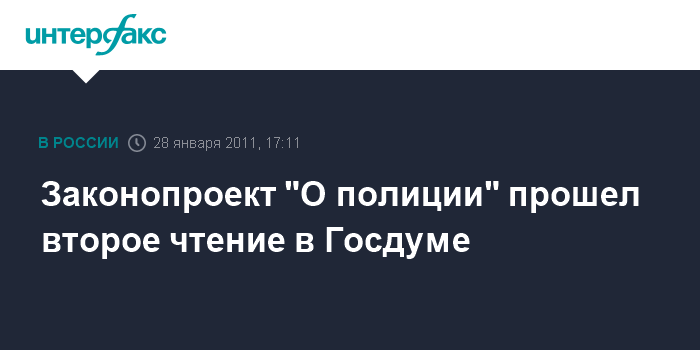 Москва. 28 января. INTERFAX.RU - Госдума на заседании в пятницу приняла во втором чтении президентский законопроект "О полиции", рассмотрев более 550 поправок к этому документу и поддержав 144 из них.