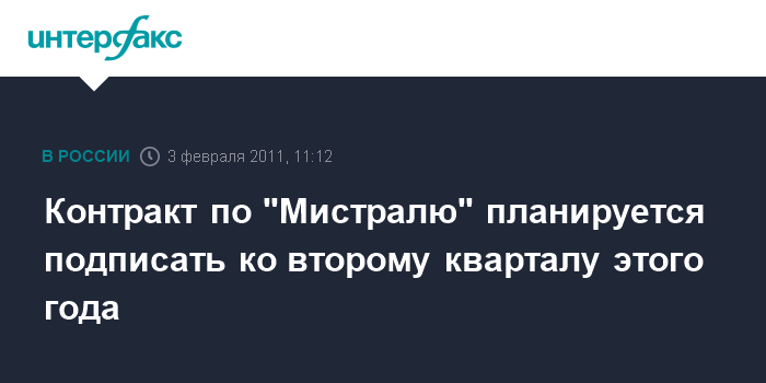 Москва. 3 февраля. INTERFAX.RU - В Минобороны России заявили, что подписание контракта о постройке десантных вертолетоносных кораблей типа "Мистраль" можно ожидать в конце первого - начале второго квартала 2011 года.