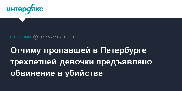 Санкт-Петербург. 3 февраля. INTERFAX.RU - Главное следственное управление СКР по Петербургу предъявило обвинение в убийстве отчиму трехлетней девочки, заявившему о ее пропаже, сообщает сайт ведомства в четверг.