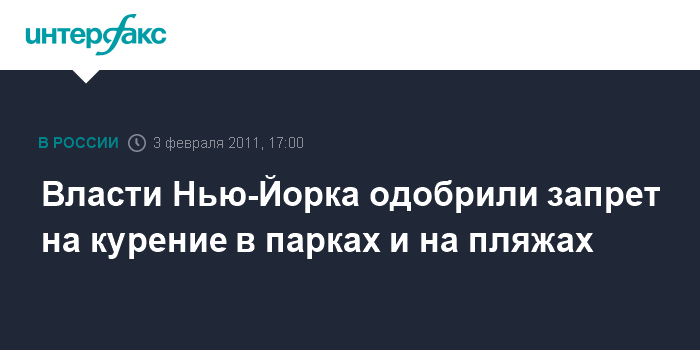 Вашингтон. 3 февраля. INTERFAX.RU - Городской совет Нью-Йорка одобрил запрет на курение на территории парков и пляжей города, сообщает в четверг американская телекомпания CNN.