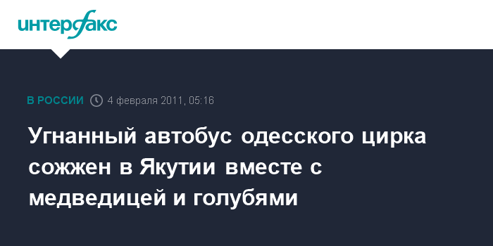 Угнанный автобус одесского цирка сожжен в Якутии вместе с медведицей и голубями