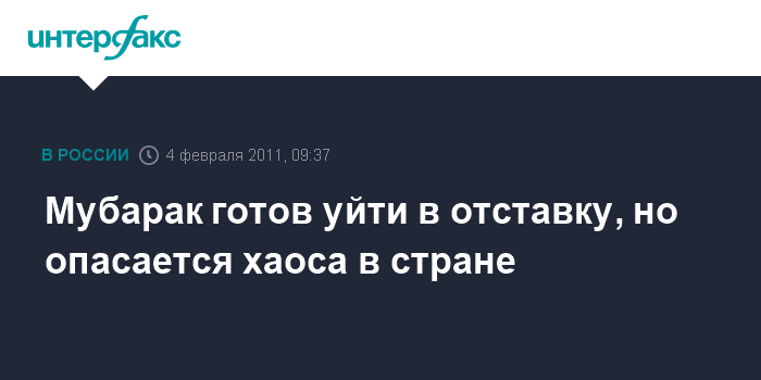 Вашингтон. 4 февраля. INTERFAX.RU - Президент Египта Хосни Мубарак в интервью американскому телеканалу ABC сообщил, что хотел бы уйти в отставку, но опасается, что после этого страна погрузится в хаос.