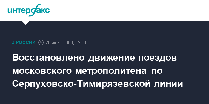 Москва. 26 июня. ИНТЕРФАКС-МОСКВА - Специалисты московского метрополитена восстановили движение на участке между станциями "Владыкино" и "Отрадное" Серпуховско-Тимирязевской линии ("серой ветки").