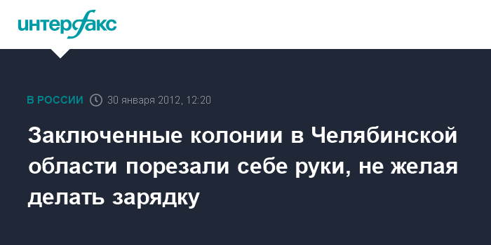 Челябинск. 30 января. INTRTFAX.RU - в исправительной колонии Копейска Челябинской области 14 заключенных порезали себе предплечья, требуя ослабления режима, сообщил руководитель пресс-службы ГУФСИН региона Иван Мишанин. Причиной акции стало требование заключенных об отмене утренней физической зарядки и свободном перемещении между локальными участками.