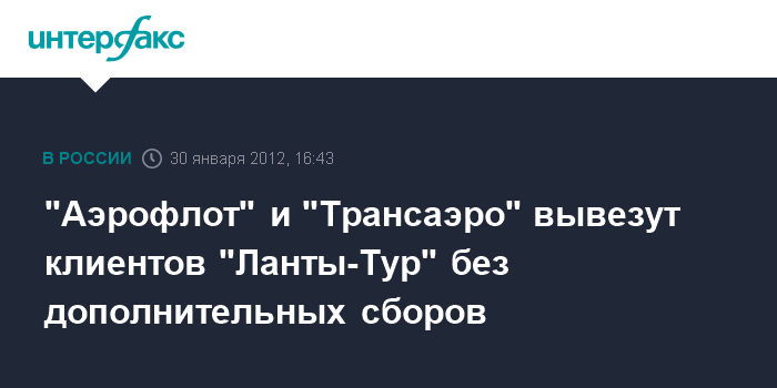 "Авиакомпании ОАО "Аэрофлот - российские авиалинии" и ОАО "Авиационная компания "Трансаэро" подтвердили намерение вывозить клиентов "Ланты-Тур Вояж" из курортных зон на свободных местах и без дополнительных сборов. Также эти авиакомпании направили в свои представительства указания принимать к перевозке пассажиров, пожелавших покинуть места отдыха раньше срока, без штрафных санкций и на свободных местах", - отмечается в пресс-релизе.