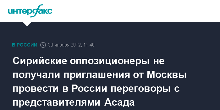 Каир. 30 января. INTERFAX.RU - Представители оппозиционного Сирийского национального совета не получали официального приглашения от российских властей принять участие в переговорах с руководством Сирии в России, сообщил в понедельник высокопоставленный представитель сирийской оппозиции Абдель Басет Седа.