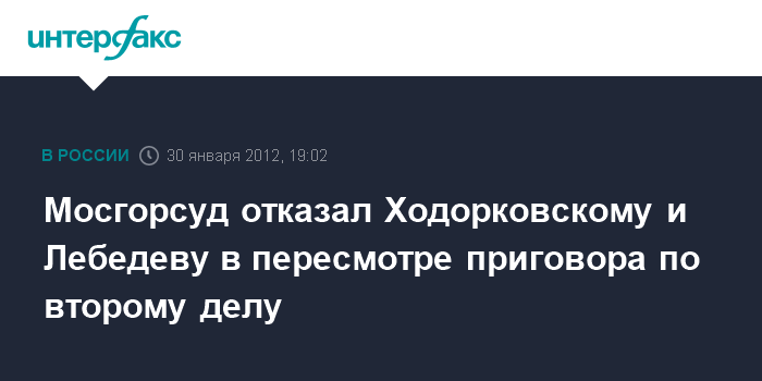 Москва. 30 января. INTERFAX.RU - Мосгорсуд отказал адвокатам экс-главы "ЮКОСа" Михаила Ходорковского и бывшего владельца МФО "Менатеп" Платона Лебедева в удовлетворении жалобы на приговор по второму уголовному делу, сообщила официальный представитель суда Анна Усачева.