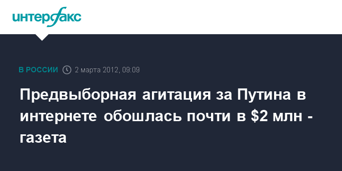 Москва. 2 марта. INTERFAX.RU - Широкая агитационная кампания, развернутая в интернете предвыборным штабом кандидата в президенты премьер-министра Владимира Путина, по оценкам экспертов, по затратности значительно превысила расходы партий на агитацию в сети перед думскими выборами, пишет в пятницу газета "Ведомости".