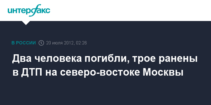 Москва. 20 июля. ИНТЕРФАКС - Легковой автомобиль и маршрутное такси столкнулись в Сигнальном проезде напротив гостиницы "Восход" на северо-востоке Москвы, два человека погибли, трое ранены.