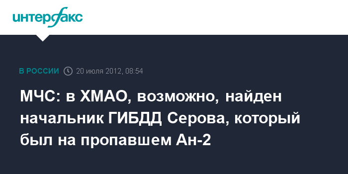Екатеринбург. 20 июля. INTERFAX.RU - МЧС проверяет появившуюся в ряде СМИ информацию о том, что в Ханты-Мансийском автономном округе в районе Пыть-Яха из леса вышел мужчина, который может быть начальником ГИБДД Серова Дмитрием Ушаковым, пропавшем в июне на самолете Ан-2.