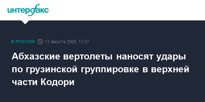 Лата (Кодорское ущелье). 12 августа. INTERFAX.RU - В районе административного центра верхней части Кодорского ущелья Абхазии Ажара слышны интенсивные перестрелки из стрелкового оружия, боевые вертолеты абхазской армии наносят удары по группировке грузинских войск, блокированной в этом районе, передает с места событий корреспондент "Интерфакса".