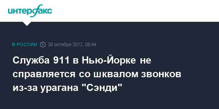 Нью-Йорк. 30 октября. INTERFAX.RU - До 10 тыс. звонков за полчаса поступает на экстренный номер 911 от жителей Нью-Йорка, обеспокоенных прохождением урагана "Сэнди", сообщает американское издание The New-York Times со ссылкой на мэра города Майкла Блумберга.