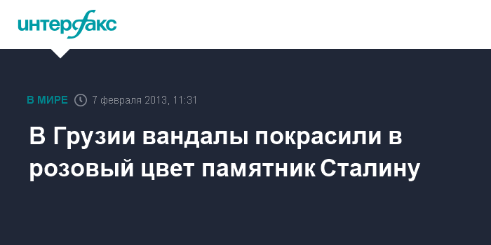 Тбилиси. 7 февраля. INTERFAX.RU - В грузинском селе Акура (регион Кахетия) неизвестные в ночь на четверг сняли с постамента бюст Сталина и облили его розовой краской, сообщают грузинские СМИ. Местные жители в беседе с журналистами назвали эти действия "вандализмом". По их мнению, никто из проживающих в селе не стал бы портить памятник.
