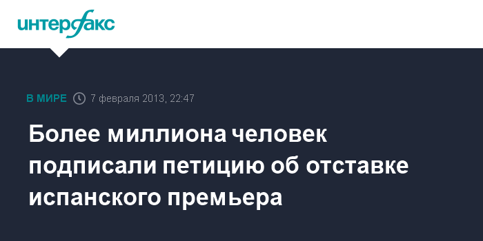 Мадрид. 7 февраля. INTERFAX.RU - Уже более миллиона человек подписали в Интернете петицию, авторы которой призывают премьера Испании Мариано Рахоя, оказавшегося в центре коррупционного скандала, уйти в отставку.
