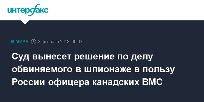 Оттава. 8 февраля. INTERFAX.RU - Суд канадского города Галифакс в пятницу, как ожидается, вынесет окончательное решение по делу младшего лейтенанта канадских ВМС Джефри Дилайла, которому предъявлены обвинения в шпионаже в пользу России.