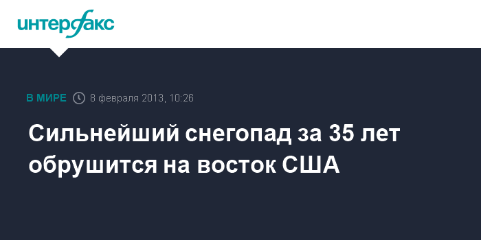 Бостон. 8 февраля. INTERFAX.RU - Национальная метеорологическая служба США предупредила американцев о надвигающейся на Новую Англию (штаты северо-восточного побережья - Коннектикут, Мэн, Массачусетс, Нью-Гэмпшир, Род-Айленд, Вермонт) и соседние регионы снежной буре, которая может стать самой сильной за 35 лет.