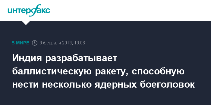 Дели. 8 февраля. INTERFAX.RU - Организация оборонных исследований и разработок Индии (DRDO) работает над созданием новейшей баллистической ракеты большой дальности Agni-VI, которая будет способна нести несколько ядерных боеголовок, сообщает в пятницу индийский телеканал NDTV.