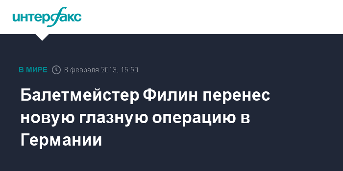 Москва. 8 февраля. ИНТЕРФАКС - Художественному руководителю балетной труппы Большого театра Сергею Филину сделана успешная глазная операция в Германии, сообщил "Интерфаксу" в пятницу источник, близкий к Минздраву РФ.