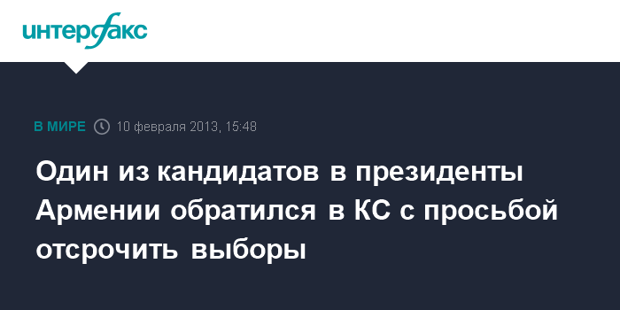 Ереван. 10 февраля. INTERFAX.RU - Пострадавший в результате покушения кандидат в президенты Армении Паруйр Айрикян обратился в воскресенье в Конституционный суд республики с просьбой перенести на две недели дату проведения намеченных на 18 февраля президентских выборов.