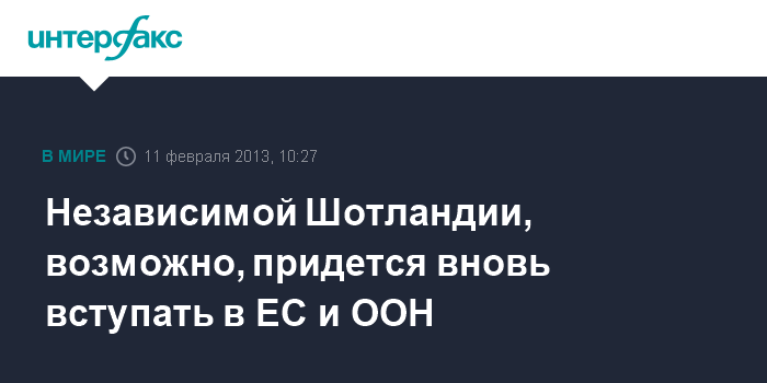 Лондон. 11 февраля. INTERFAX.RU - В случае обретения независимости от Великобритании, Шотландии, вероятно, придется повторно вступать в международные организации, заявили в понедельник в британском правительстве.