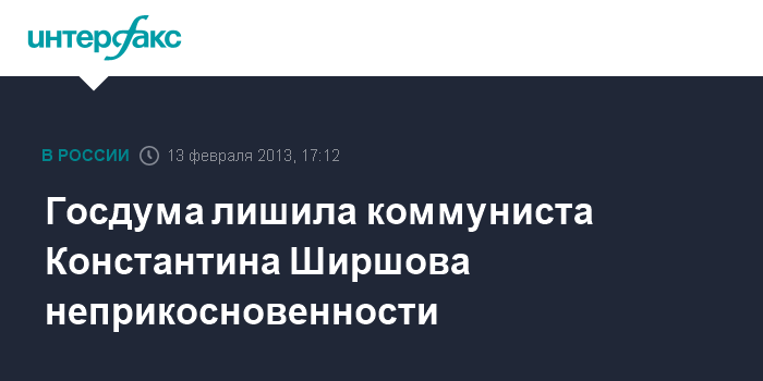 Москва. 13 февраля. INTERFAX.RU - Государственная дума РФ в среду удовлетворила ходатайство Генпрокуратуры, дав согласие на лишение неприкосновенности депутата-коммуниста Константина Ширшова, а также на привлечение его в качестве обвиняемого.
