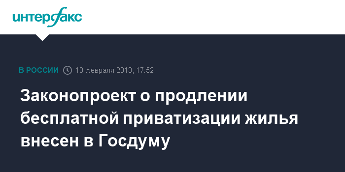 Москва. 13 февраля. INTERFAX.RU - Законопроект о продлении бесплатной приватизации жилья до 1 марта 2015 года внесен в Госдуму. Информация об этом содержится в электронной базе документов нижней палаты парламента.