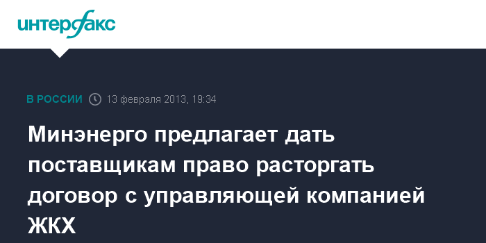 Ново-Огарево. 13 февраля. INTERFAX.RU - Минэнерго России предлагает внести изменения в Жилищный кодекс, устанавливающие право поставщиков расторгать договор с управляющей компанией (УК) и заключать договоры напрямую с потребителями, если задолженность УК превышает два расчетных периода, сообщил журналистам министр энергетики Александр Новак.
