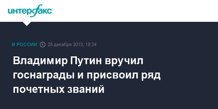 Москва. 25 декабря. INTERFAX.RU - Президент РФ Владимир Путин в среду в преддверии Нового года вручил в Кремле государственные награды и присвоил почетные звания выдающимся военным, артистам, ученым, государственным деятелям.