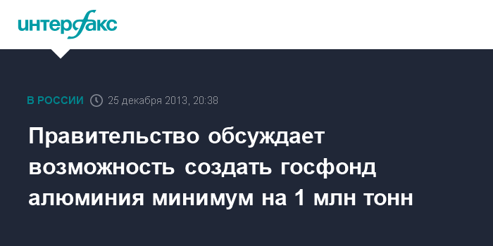 Москва. 25 декабря. INTERFAX.RU - Правительство России обсуждает предложение ОК "РусАл" о создании госфонда алюминия объемом минимум 1 млн тонн, но пока не видит для это ресурсов, заявил вице-премьер РФ Аркадий Дворкович в интервью каналу "Россия 24".