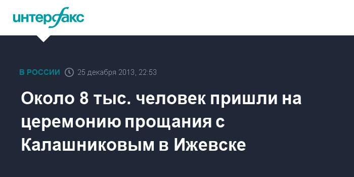 Москва. 25 декабря. INTERFAX.RU - Первый день прощания с умершим в понедельник конструктором-оружейником Михаилом Калашниковым завершился в Ижевске, церемония продолжится в четверг.