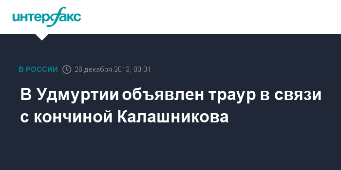 "В связи с кончиной 23 декабря 2013 года Михаила Тимофеевича Калашникова, советского и российского конструктора стрелкового оружия, почетного гражданина Удмуртской Республики, выражая скорбь по умершему и соболезнуя его родным и близким, постановляю объявить 26 и 27 декабря 2013 года днями траура в Удмуртской Республике", - говорится в указе, текст которого распространила пресс-служба президента и правительства республики.