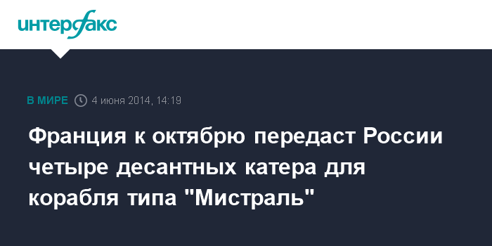 Москва. 4 июня. INTERFAX.RU - Филиал компании STX France во французском городке Лориан до октября намерен подготовить к передаче ВМФ России четыре десантных катера, предназначенных для первого десантного вертолетоносного корабля-дока (ДВКД) типа "Мистраль" - "Владивосток", построенного по заказу ВМФ России на верфях STX в Сен-Назере, сообщили в среду "Интерфаксу" в компании.