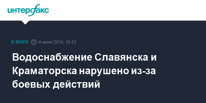 Москва. 4 июня. INTERFAX.RU - Водоснабжение городов Славянск, Краматорск, Дружковка и Константиновка Донецкой области нарушено из-за обесточивания объектов коммунального предприятия "Вода Донбасса", сообщила пресс-служба компании "ДТЭК Донецкоблэнерго".