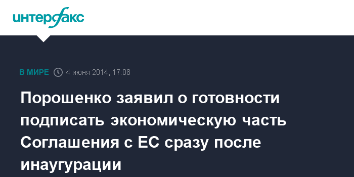 Москва. 4 июня. INTERFAX.RU - Новоизбранный президент Украины Петр Порошенко заявляет о готовности подписать экономическую часть Соглашения об ассоциации с Европейским Союзом сразу после вступления в должность главы государства.