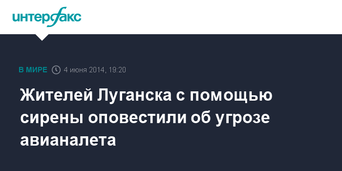 Москва. 4 июня. INTERFAX.RU - В Луганске в среду вечером зазвучала сирена, оповещающая об авиационной угрозе. Над городом летает военный самолет, передал корреспондент "Интерфакса".