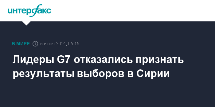 Москва. 5 июня. INTERFAX.RU - Лидеры G7 осудили президентские выборы в Сирии, говорится в коммюнике саммита G7, распространенном в Брюсселе.