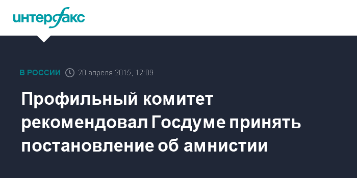 Москва. 20 апреля. INTERFAX.RU - Комитет по гражданскому, уголовному, арбитражному и процессуальному законодательству рекомендовал Госдуме рассмотреть и принять в первом чтении в среду президентский проект постановления об амнистии в связи с 70-летием Победы.