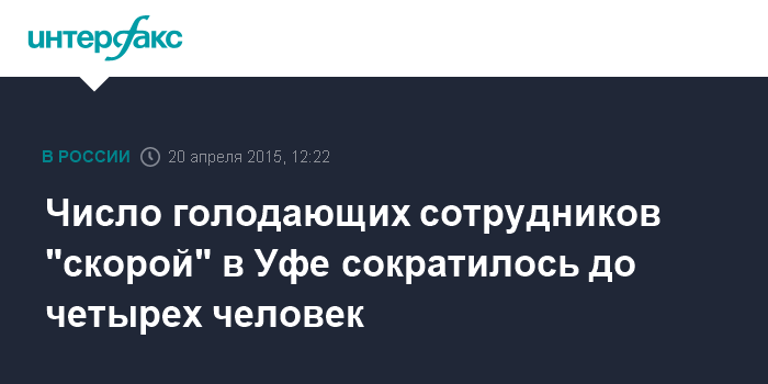 Москва. 20 апреля. INTERFAX.RU - Еще четыре сотрудника станции скорой медицинской помощи (ССМП) Уфы прекратили голодовку протеста, сообщила в понедельник "Интерфаксу" участница акции Ирина Тишина.