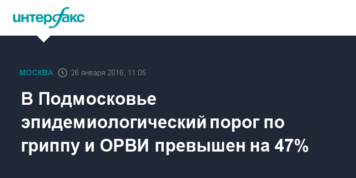 "В период с 16 по 22 января на территории Московской области зарегистрировано 64 360 случаев заболеваний ОРВИ и 122 случая гриппа. Среди детей до 14 лет зарегистрировано 38 600 случаев заболеваний ОРВИ и 51 случай гриппа. Показатель заболеваемости среди совокупного населения на 3-й неделе 2016 года выше расчетных эпидемических пороговых величин на 47%", - говорится в сообщении.