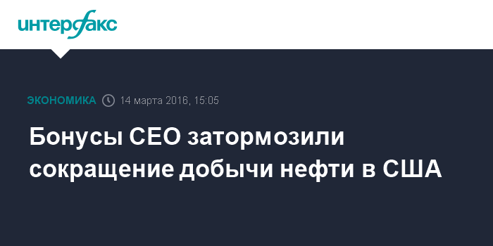 Москва. 14 марта. INTERFAX.RU – Нежелание американских нефтегазовых компаний сокращать добычу, несмотря на падение цен на топливо, отчасти объясняется тем, что бонусы топ-менеджеров зависят от достижения целевых показателей по объему добычи и размеру разведанных запасов, пишет The Wall Street Journal.