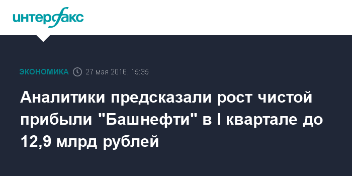 Москва. 27 мая. INTERFAX.RU - Чистая прибыль "Башнефти" по МСФО в первом квартале 2016 года увеличилась по сравнению с аналогичным периодом прошлого года на 13,4% - до 12,917 млрд рублей, свидетельствуют данные аналитиков из девяти инвесткомпаний и банков, опрошенных "Интерфаксом".